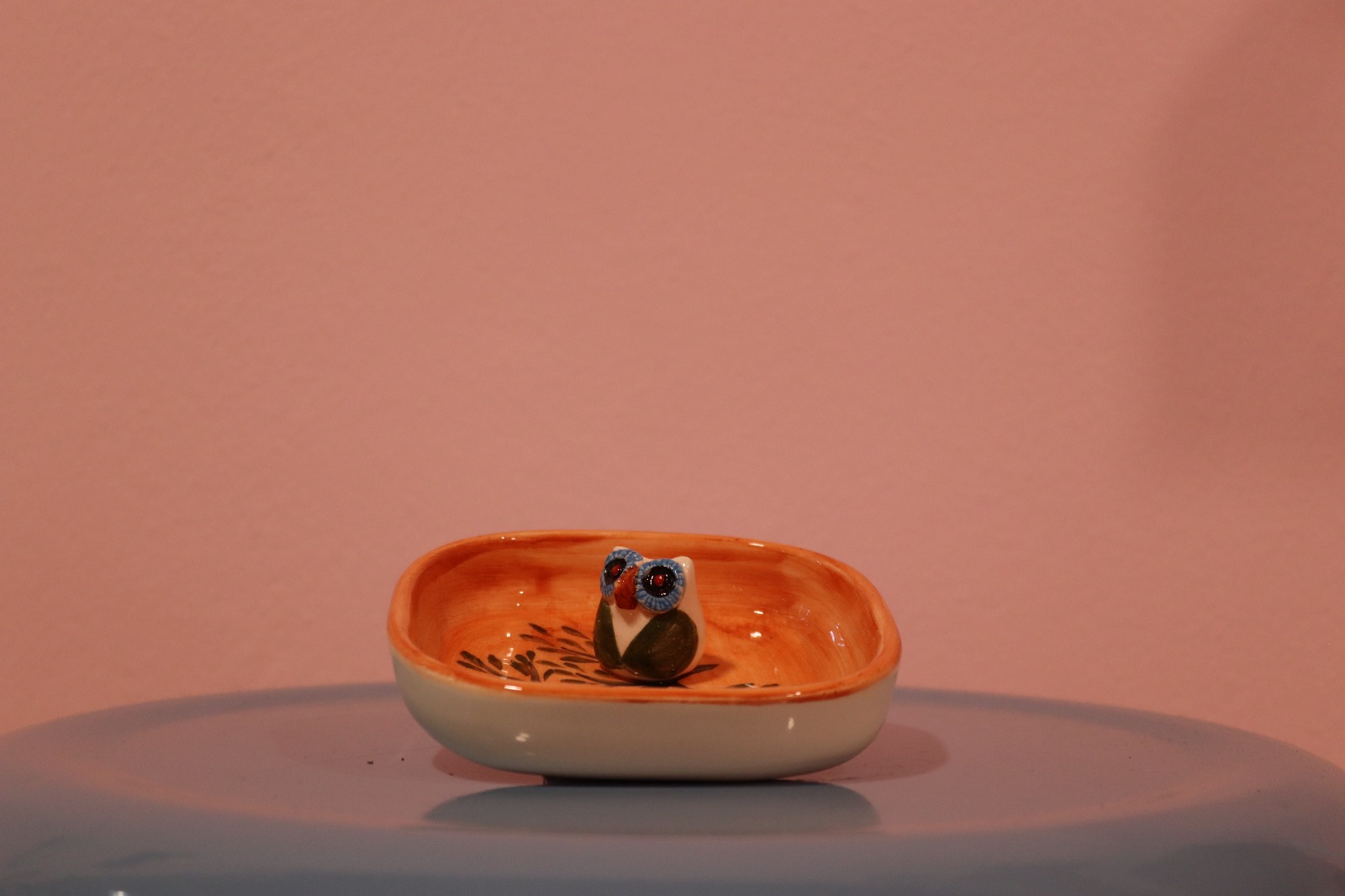 اگه دنبال یه وسیله کوچیک ولی پر از شخصیت برای دکور خونهای، این جا عودی جغد کوچولو واقعاً دلبری میکنه! تماماً کار دست و با رنگهای گرم و قشنگ لعابکاری شده. جغد کوچولوی وسط ظرف هم با اون چشمهای مشکی براقش، حسابی جذابش کرده.
